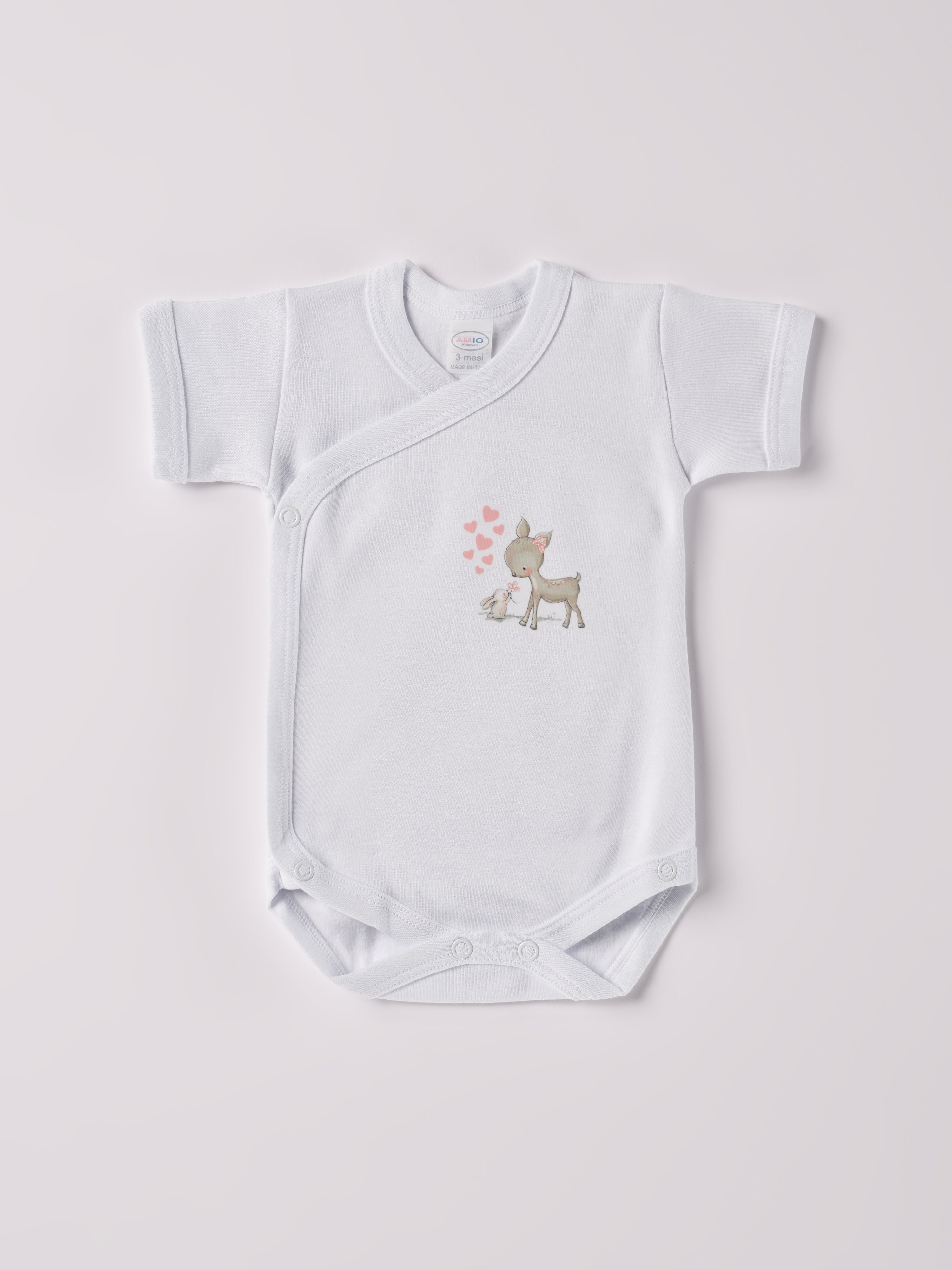 AMIO Firenze weißer Kurzarm-Wickelbody aus 100% Baumwolle mit Reh-Print