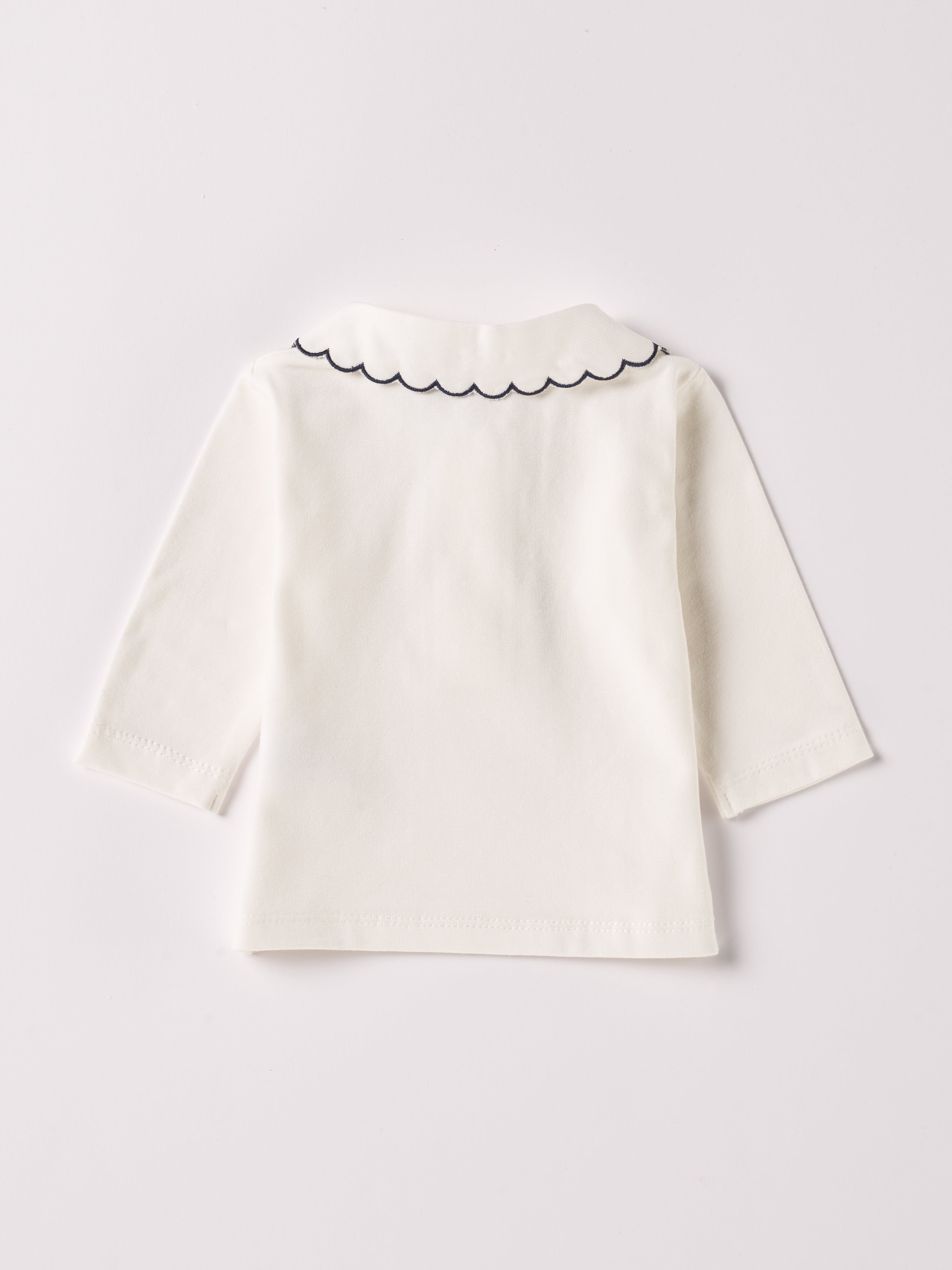 Die Interlock-Bluse für Baby Mädchen von AMIO Firenze ist aus weicher Baumwolle gefertigt und bietet durch das Innenflanell ein äußerst angenehmes Tragegefühl. Der mit einer dunkelblauen Naht bestickte Kragen und die echten Perlmuttknöpfe verleihen der Bluse einen besonders stilvollen Touch.