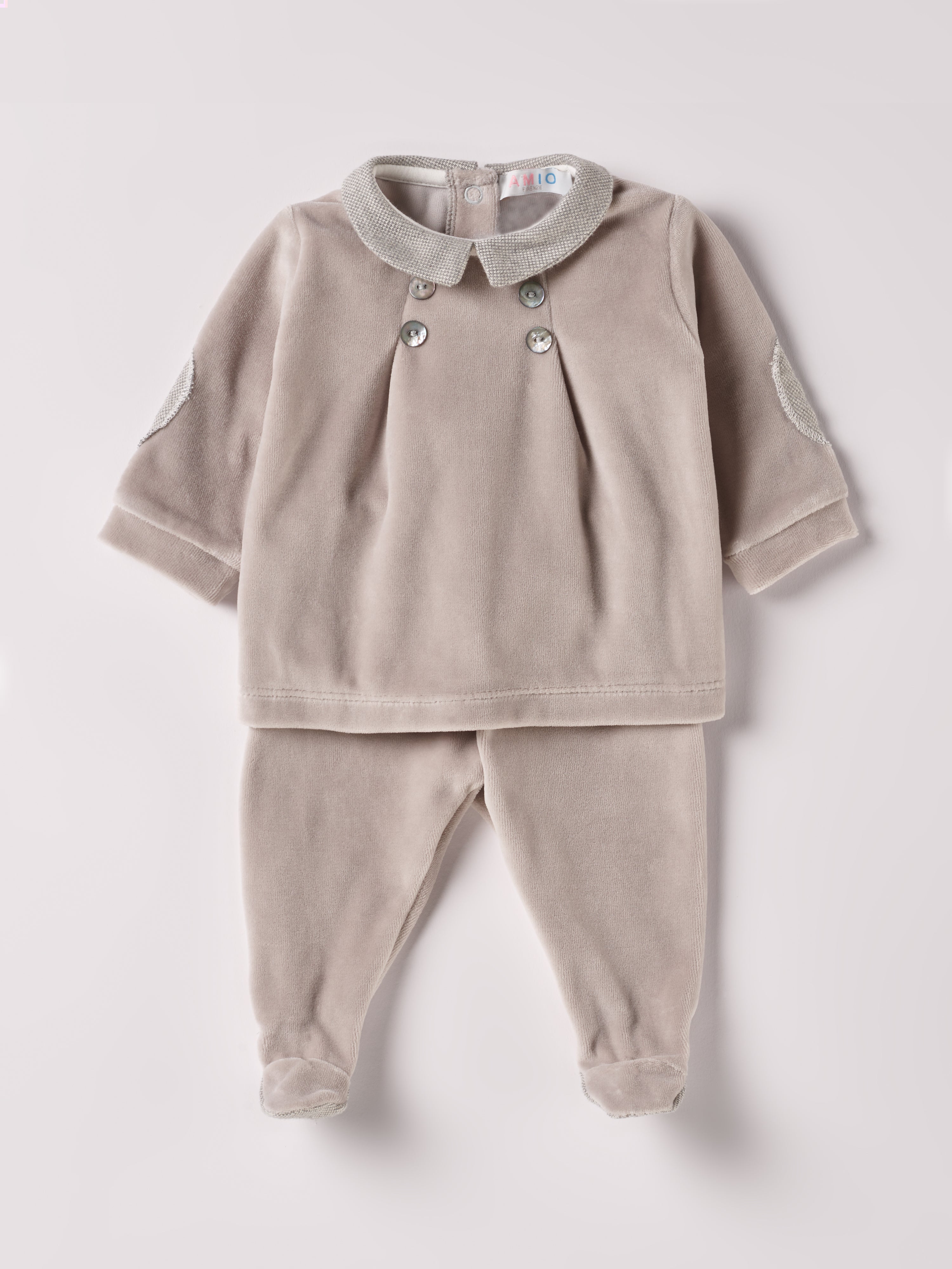 Der weiche und wärmespendende Zweiteiler von AMIO Firenze mit Kragen und Ellbogenpatches ist der perfekte Begleiter für den Alltag in der kalten Jahreszeit. Die echten Perlmuttknöpfe auf der Vorderseite veredeln den Look. Maximaler Tragekomfort, gepaart mit einer herausragenden Passform aus Samt (Ciniglia). Das Set aus Oberteil und Hose ist vielseitig kombinierbar. Das Modell hat einen praktischen Schnitt, um etwa die Windel schnell und unkompliziert wechseln zu können. Ein AMIO Firenze Must-Have für jede Grundausstattung.