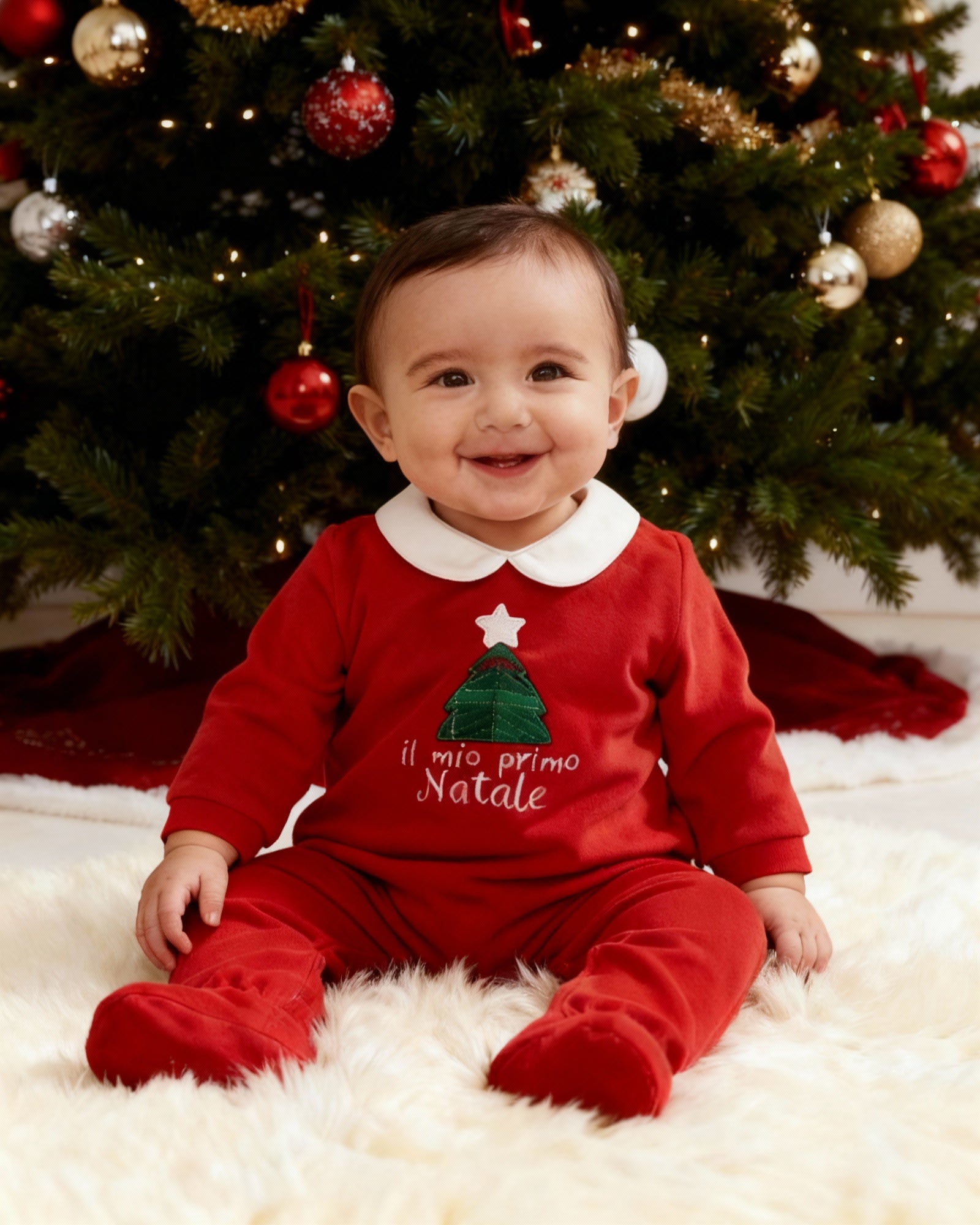 Tuta natalizia rossa AMIO Firenze con colletto e applicazione a forma di albero di Natale