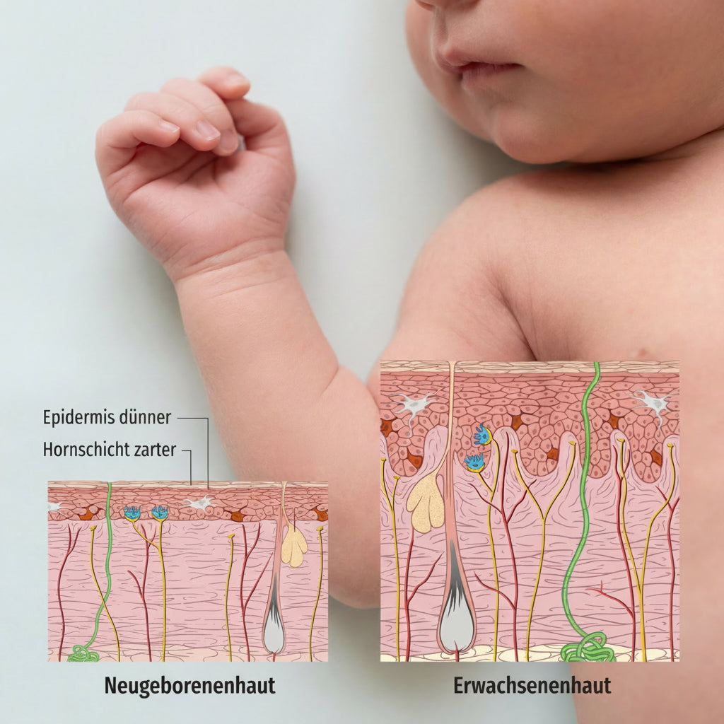 ¹Agnieszka A. Garncarczyk: Structure of children’s skin and rules for its care — Epidermis ist bis zu ~20 % dünner bei Säuglingen; Hornschicht deutlich zarter.
