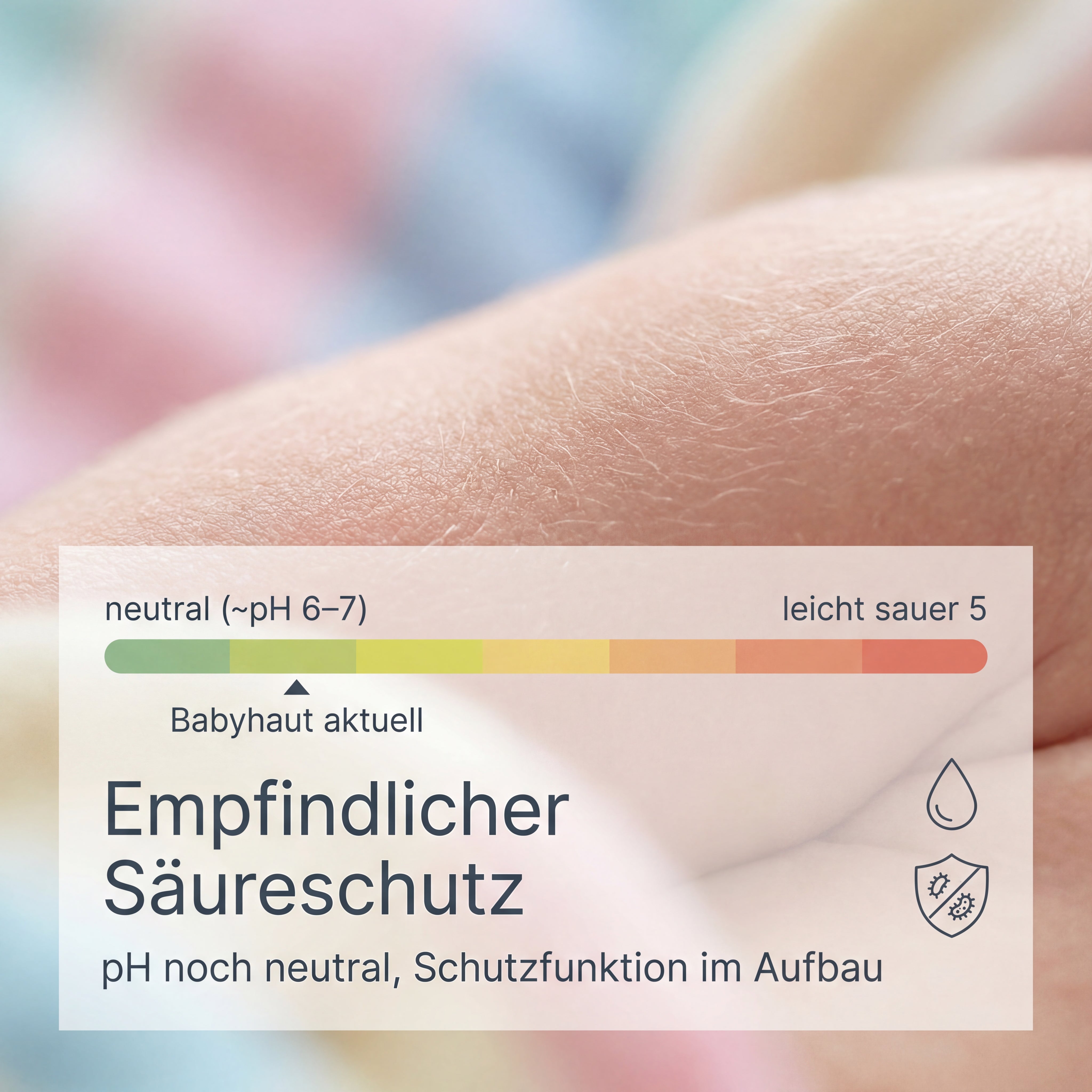 Der natürliche Säureschutzmantel der Haut, der bei Erwachsenen hilft, Reizungen und Mikroorganismen abzuwehren, ist bei Neugeborenen noch nicht vollständig stabil. Dadurch reagiert Kinderhaut sensibler auf Reibung, Feuchtigkeit und ungeeignete Materialien.